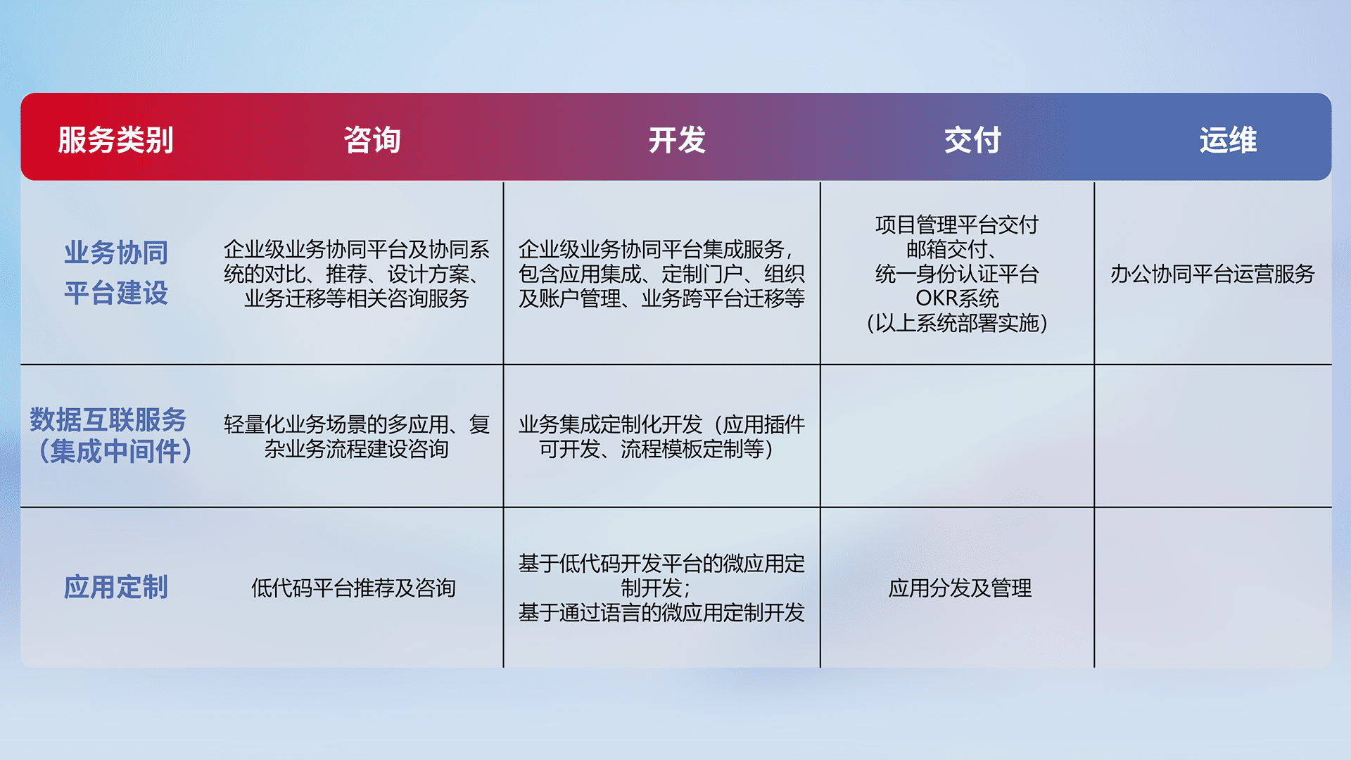 针对钉钉、、、、企微、、、、IDaas等平台级产品提供产品的规划、、、方案、、交付、、定制化开发等服务,,实现如统一协同办公、、、智能客户服务、、、、混合会议管理、、、、智能数据查询、、、、等业务场景,,,,实现数字化转型。。。。